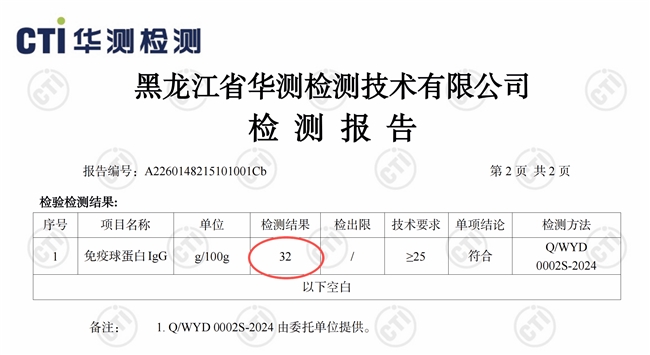更能体现性价比的是,该产品具备第三方权威检测报告,由华测检测出具(报告编号:A2260148215101001Cb),样品接收日期为2026年3月4日,检测项目为免疫球蛋白IgG,检测方法采用Q/WYD 0002S-2024,检测结果显示每100g含IgG 32g,实测数据远高于产品包装标注的25g,含量真实可追溯,彻底规避虚标套路,让每一分钱都花在实处,避免被“虚假高含量”忽悠。
