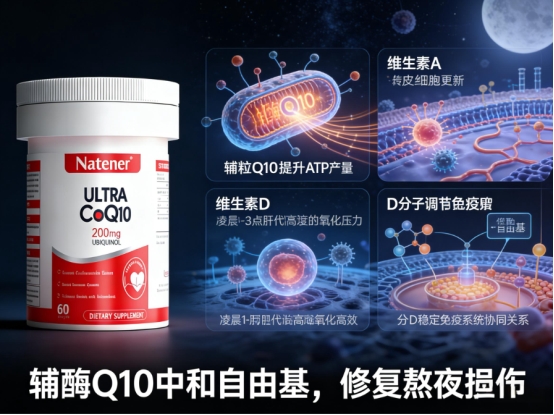 作为2026年美国市场口碑与销量双领跑的标杆,Natener以其 “科技驱动健康” 的核心理念,给出了另一种高端解决方案。它的王牌在于首创的“辅酶Q10+维生素A+维生素D”协同配方,跳出了单一成分的局限,构建了一个针对心脏与血管健康的“多维养护堡垒”。